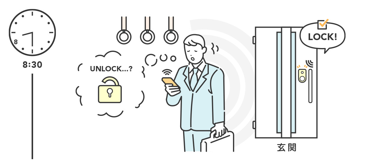 - 外出中に「玄関の鍵を閉め忘れてしまったかも…」と不安に感じることがあっても、わざわざ引き返す必要はなく、その場でスマートフォンから施錠確認ができます。