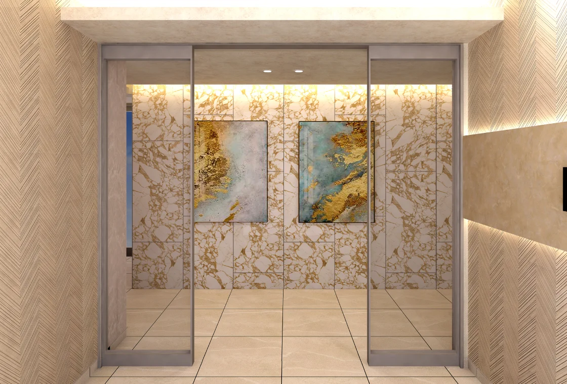 洗面室から、広々としたLDKへ自然に繋がる動線。その先にはゆったりとしたベッドルームが広がります。開放感のある間取りが、日常生活に贅沢なゆとりをもたらし、心地よい住空間を演出します。